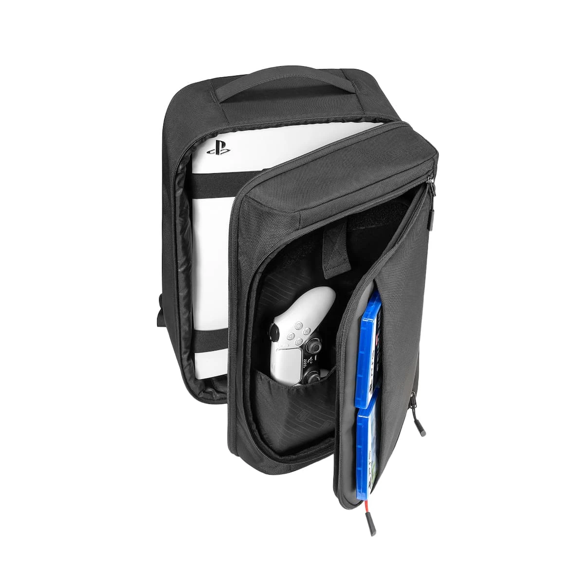 - Features three storage spaces in total. The main compartment can storage PS5 console. The middle compartment can accommodate 2 PS5 Controllers with case and headphone. The front pocket was designed to hold PS5 game discs, charging Cable, HDMI Cable, Charging Station, etc.